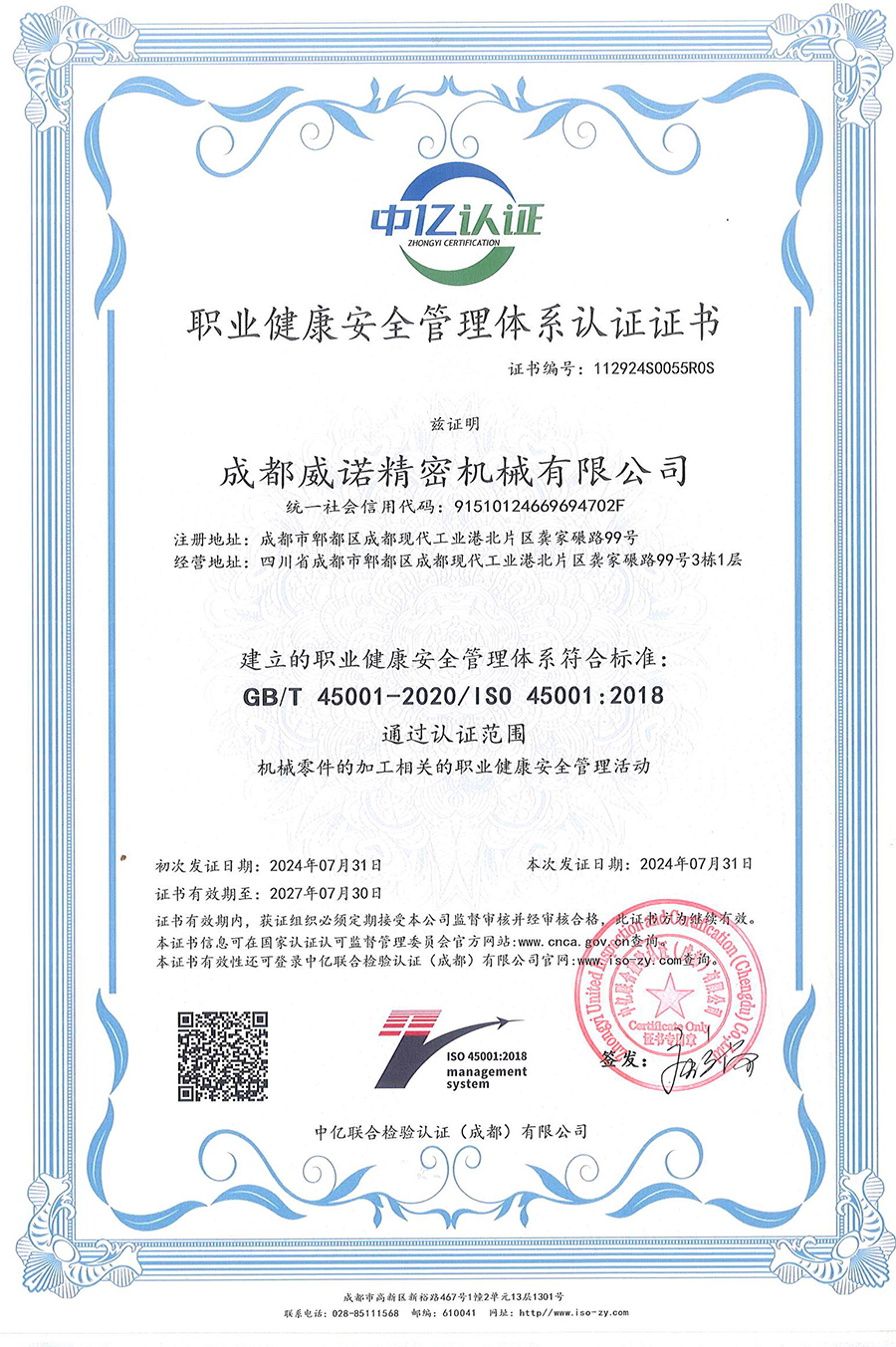 职业健康安全管理体系认证证书
